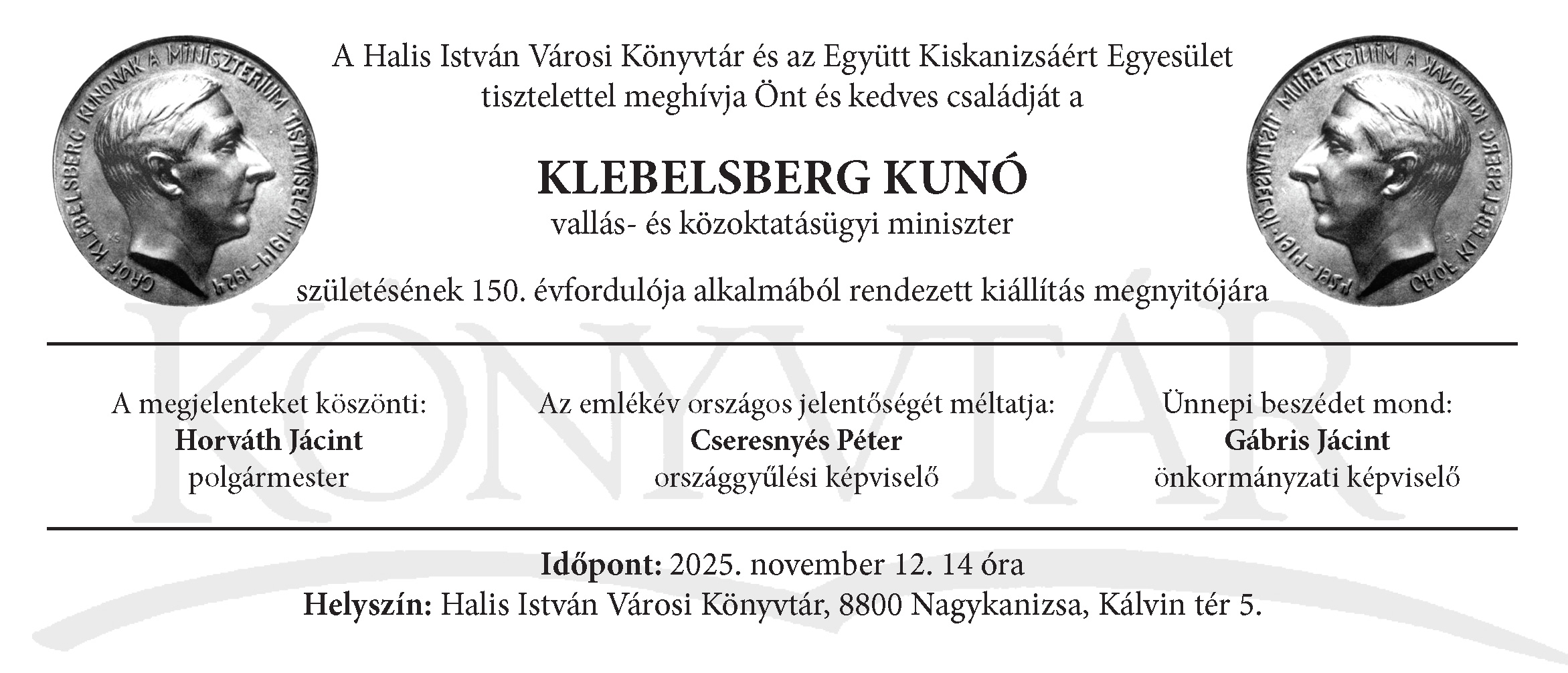 A Halis István Városi Könyvtár és az Együtt Kiskanizsáért Egyesület tisztelettel meghívja Önt és kedves családját a KLEBELSBERG KUNÓ vallás- és közoktatásügyi miniszter születésének 150. évfordulója alkalmából rendezett kiállítás megnyitójára