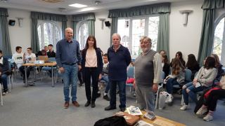 A képen a Kőrösi-iskola diákja, az iskola vezetője, Smolcz Frigyes, tanára, Passáné Bolf Mária, Gelencsér Gábor, az emlékezés előadója és Czupi Gyula, a Halis-könyvtár igazgatója láthatók.