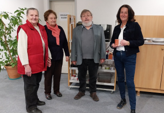 A képen láthatók még Gurdán Jánosné (Rózsika) és Sziva Lászlóné (Marika) a Kórházas lányok csoportból, valamint Czupi Gyula könyvtárigazgató.