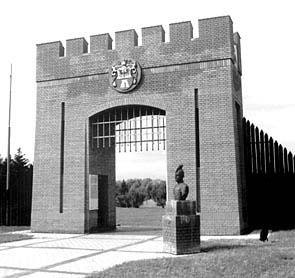 a stilizált várkapu. Az előtte látható mellszobor Vörös János szobrászművész alkotása, a vár leghíresebb kapitányát, Thury